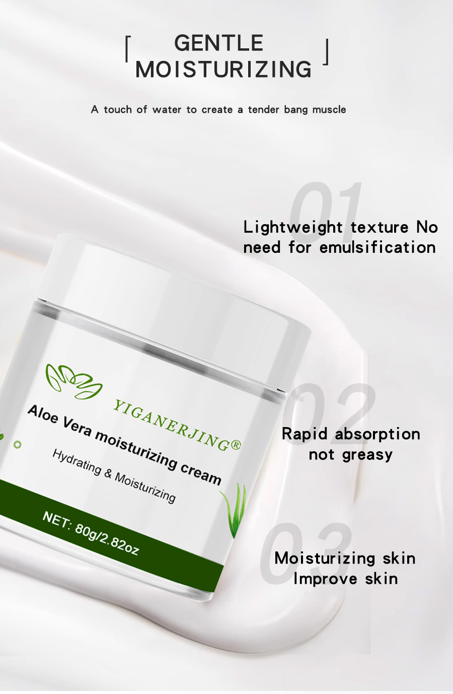 YIGANERJING Aloe Moisturizing Cream is a specialized skincare product designed to provide nourishment and hydration to the skin. Its unique formula contains pure aloe vera extract, aiming to deliver comprehensive moisturizing and soothing effects. Product Details: Aloe Nourishment: YIGANERJING Aloe Moisturizing Cream uses high-quality aloe vera extract, enriched with abundant nutrients such as vitamins, amino acids, and various minerals. It effectively nourishes the skin, helping to maintain moisture and nutrient balance. Deep Hydration: This moisturizing cream boasts excellent hydrating capabilities, swiftly penetrating deep into the skin to lock in moisture, leaving the skin soft and supple. Soothing & Repairing: Aloe has outstanding soothing and repairing properties, helping to alleviate skin discomfort and reduce sensitivity, promoting the recovery of healthy skin. Non-greasy & Refreshing: YIGANERJING Aloe Moisturizing Cream has a refreshing and non-greasy texture, providing a comfortable and natural feel to the skin. It is suitable for all skin types. Long-lasting Moisture: Clinically tested, this moisturizing cream ensures long-lasting hydration, delivering enduring comfort to the skin. Natural Ingredients: YIGANERJING Aloe Moisturizing Cream is formulated with pure aloe vera extract and is free from harmful chemicals, making it safe and non-irritating, even for sensitive skin. Volume: 80g Embrace YIGANERJING Aloe Moisturizing Cream, allowing your skin to experience the natural goodness of aloe, radiating a bright and smooth glow. With YIGANERJING Aloe Moisturizing Cream, your skin will stay hydrated, healthy, and beautifully radiant! |