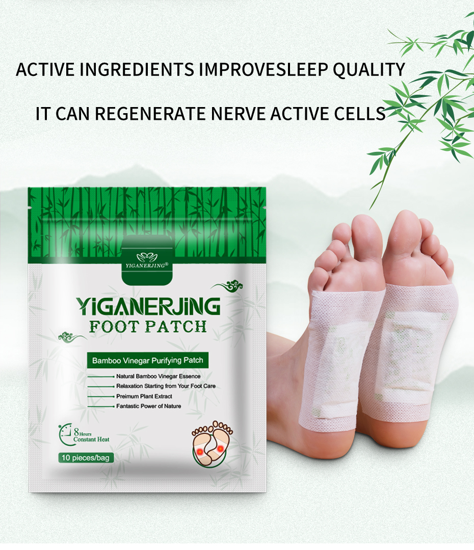 YIGANERJING foot patches are a natural therapy that uses traditional Chinese herbal formula to soothe fatigue, improve sleep, and promote blood circulation when applied to the feet. Each pack contains 10 patches, and it's recommended to use continuously