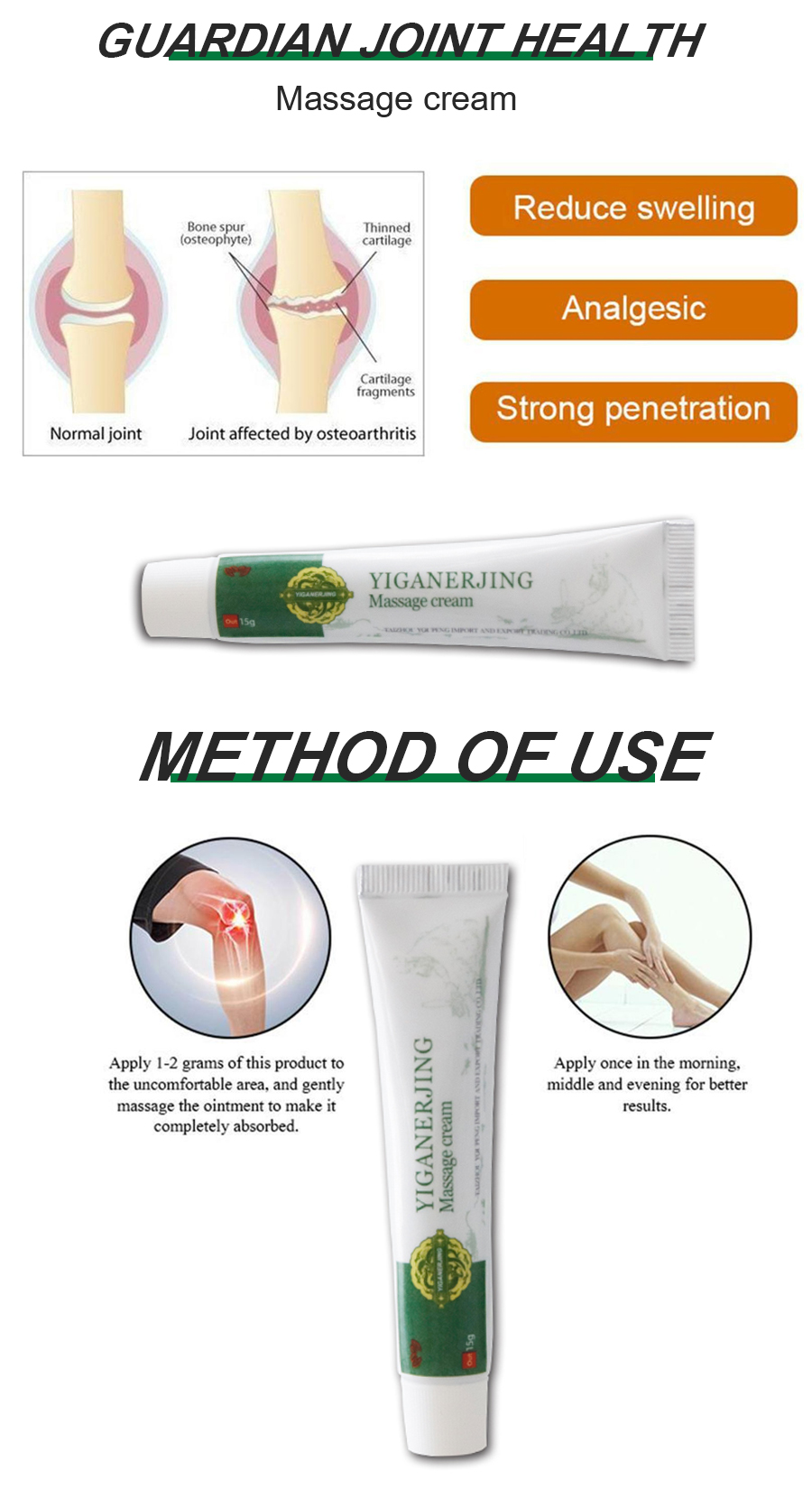 YIGANERJING Massage Cream (15g): A unique and effective massage cream infused with the natural herbal power of YIGANERJING. Specially designed to provide soothing relief for various aches and pains, such as sore muscles, joint pain, strains, and sprains. This cream utilizes natural plant ingredients, offering a gentle and non-irritating massage experience. Its fast-absorbing texture provides immediate comfort without leaving a greasy residue. Simply apply the YIGANERJING Massage Cream to the affected area and gently massage until absorbed. Feel the pain gradually easing away as your body relaxes, leaving you feeling refreshed and rejuvenated. The compact 15g packaging allows for easy carrying and on-the-go use. Whether it's post-exercise muscle soreness, discomfort from prolonged sitting, or fatigue-induced joint pain, YIGANERJING Massage Cream is your reliable companion for body care. Experience the comforting and relaxing effects of this massage cream, bringing vitality and comfort to your every day. Make YIGANERJING Massage Cream your caring choice in your daily self-care routine. |