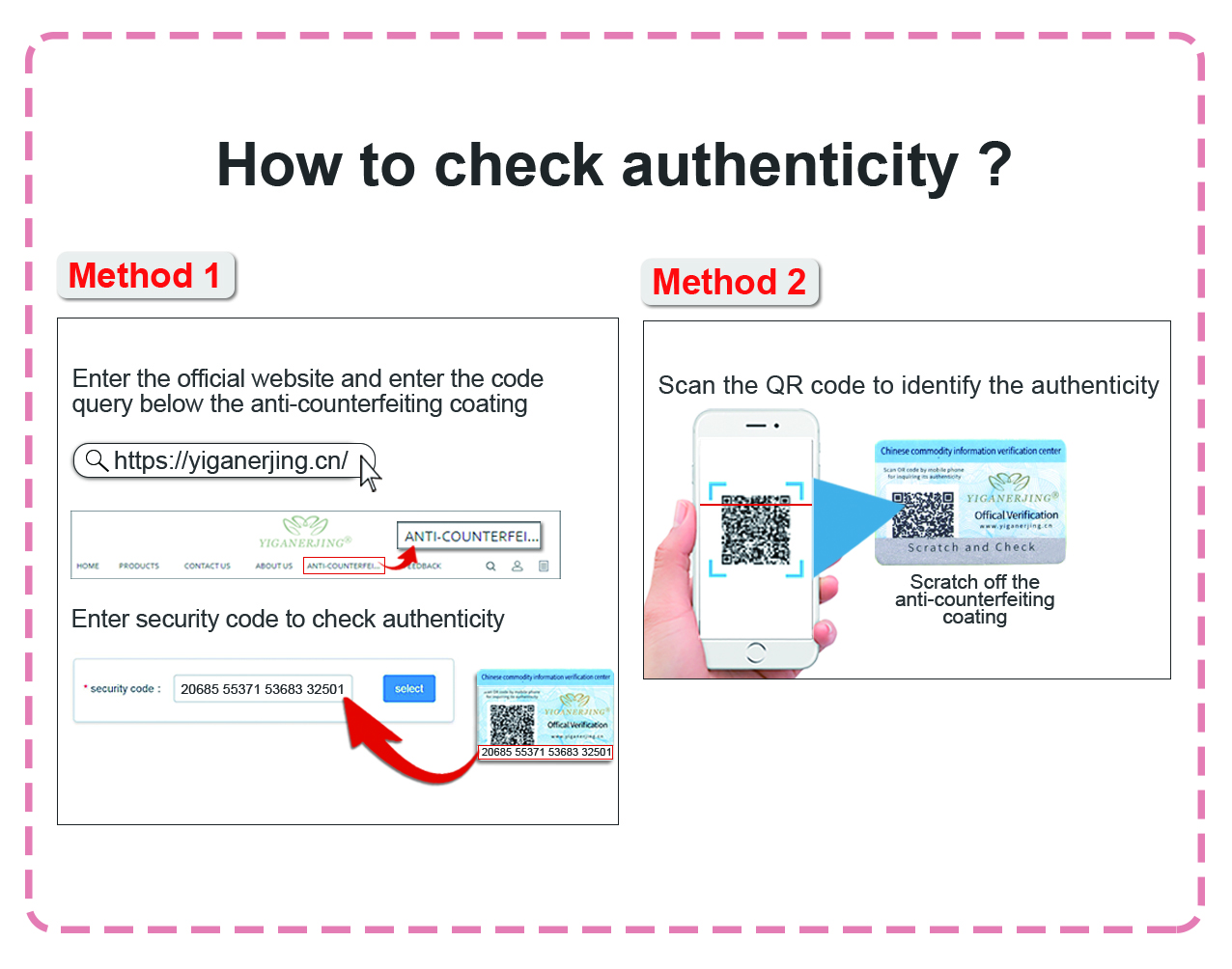 Method 1: Scan the anti-counterfeiting code QR code on the packaging and check on our official website.